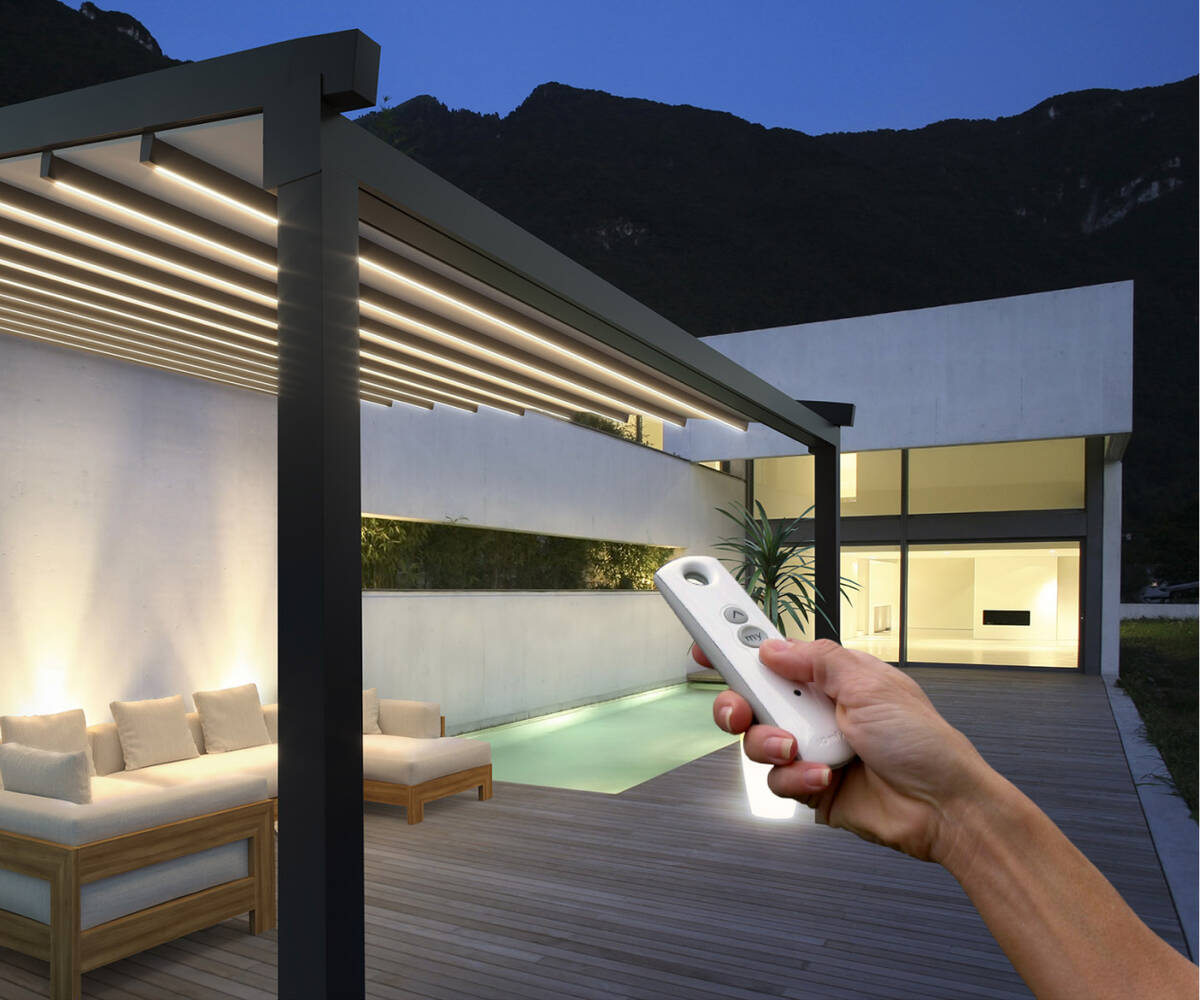 Управляйте системой дистанционно прямо со своего смартфона из любой точки мира! Современные системы автоматизации и управления максимально упростят управление перголой. Индивидуальные настройки, позволяют создавать сценарии автоматического открытия и закрытия сдвижной крыши в зависимости от солнечной активности и силы ветра.