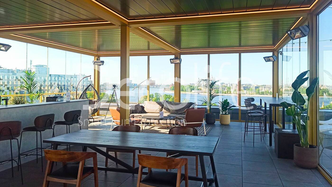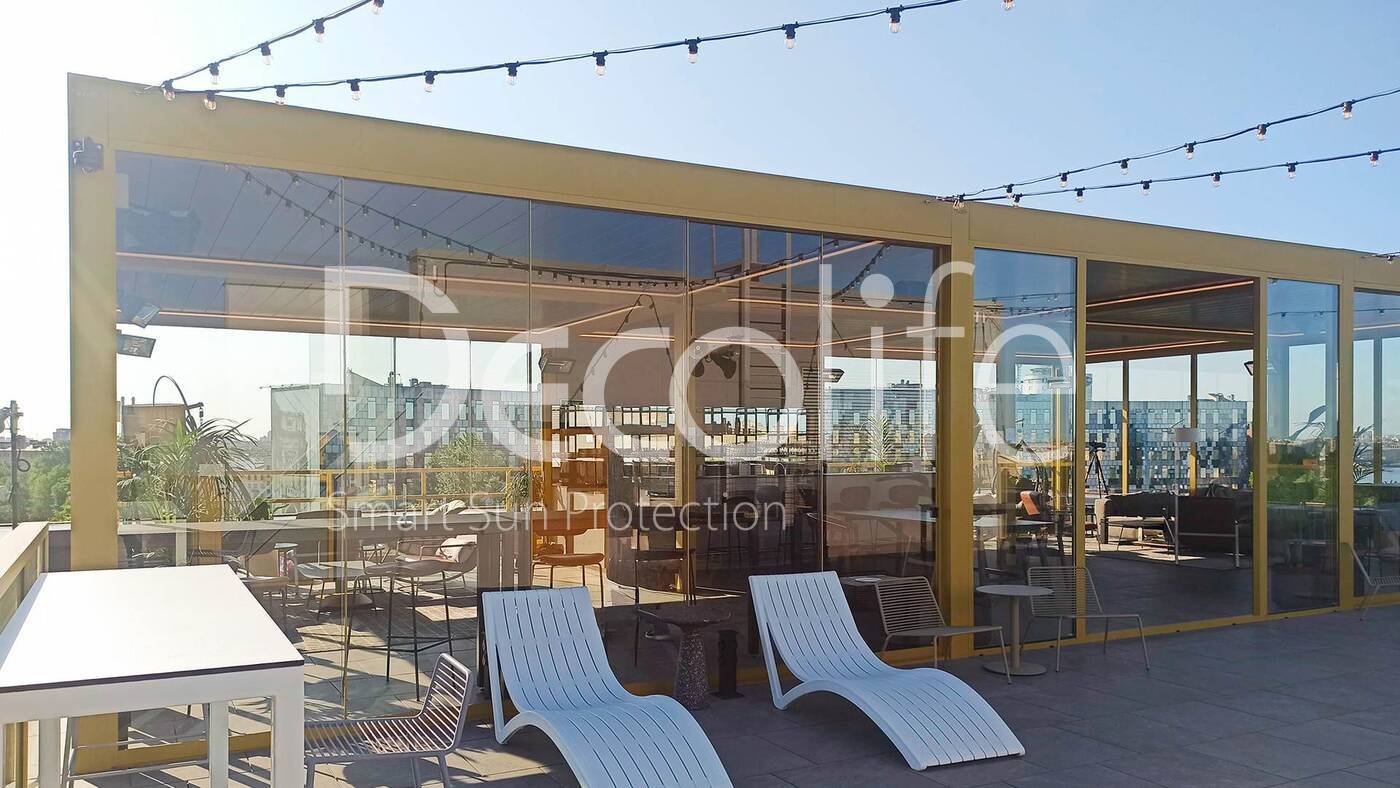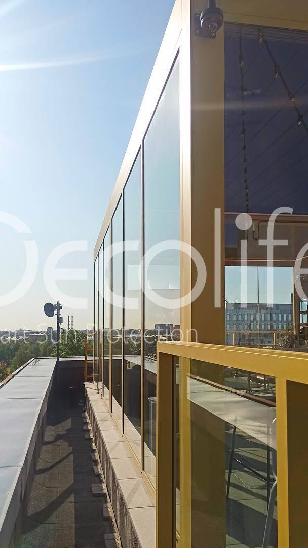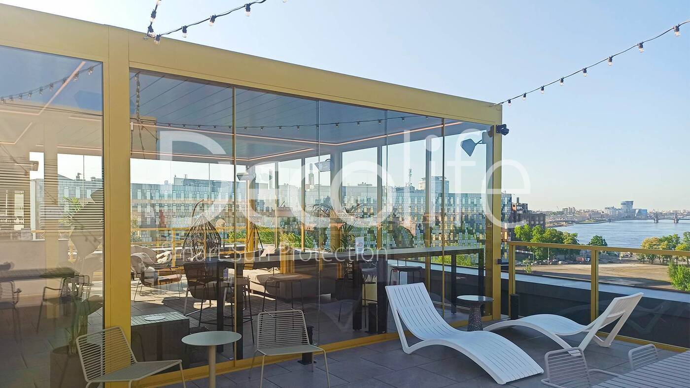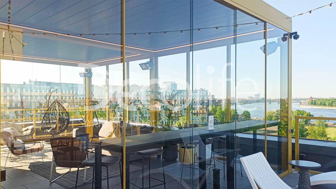 Главная / Наши работы / Пергола Decolife B700-25С + остекление FC58, S200 Лаунж зона "Яндекс", БЦ "Феррум"