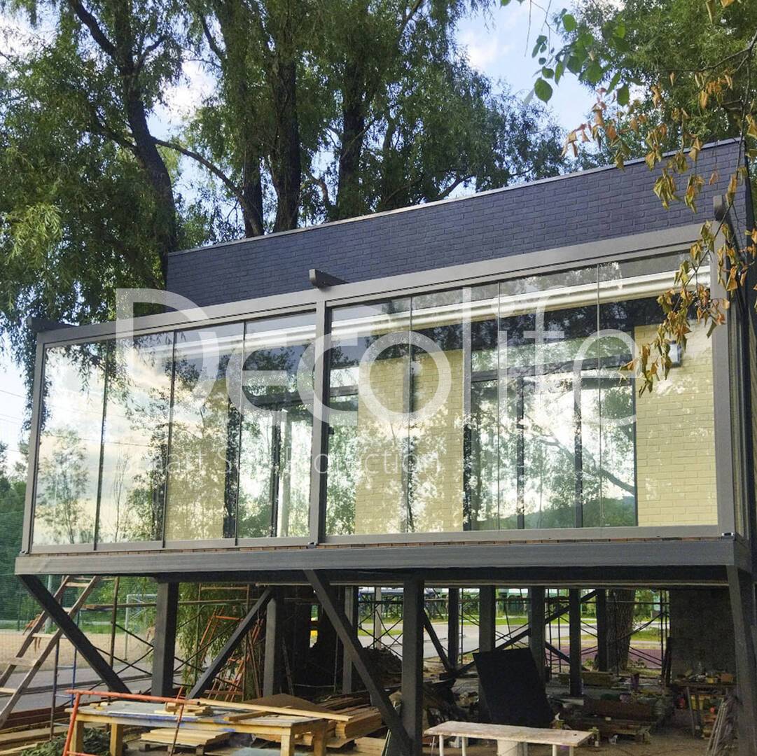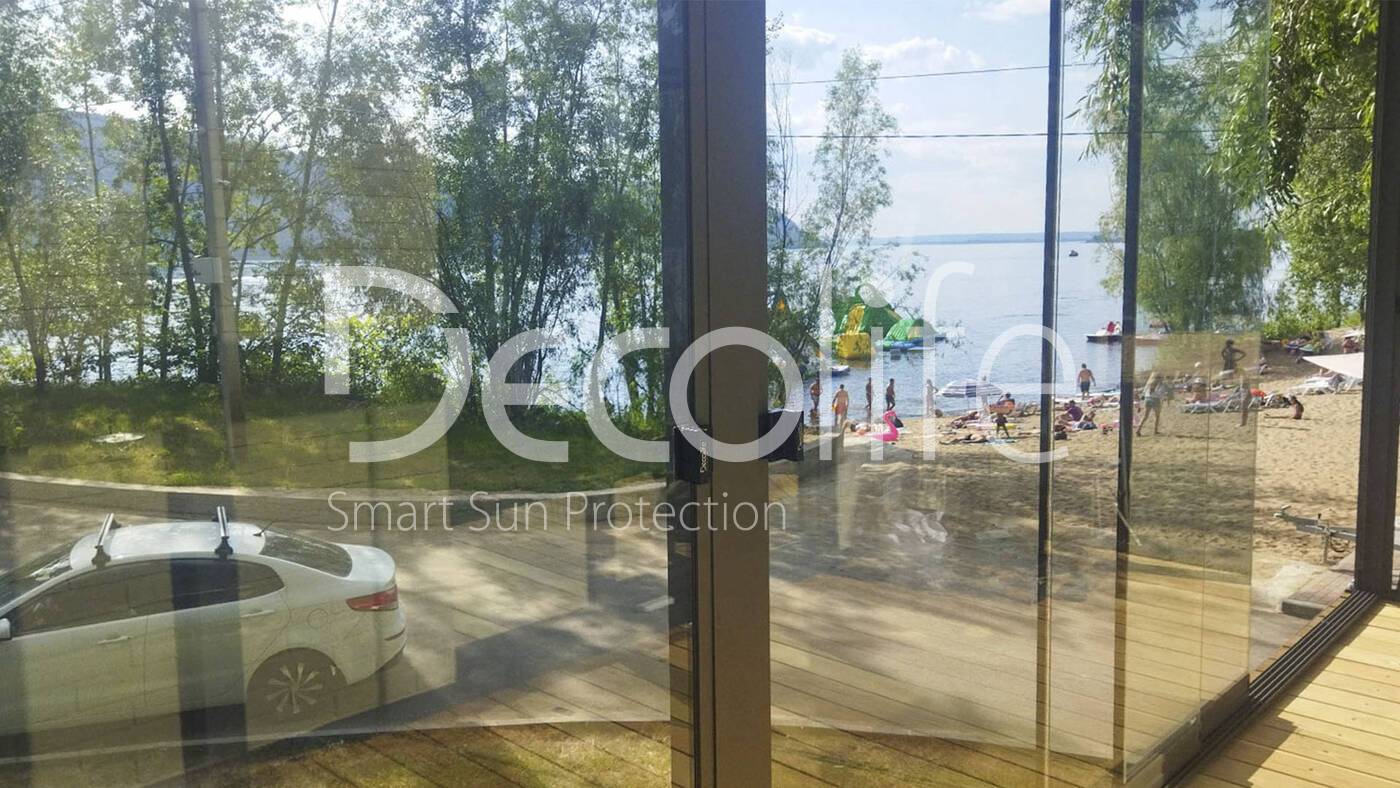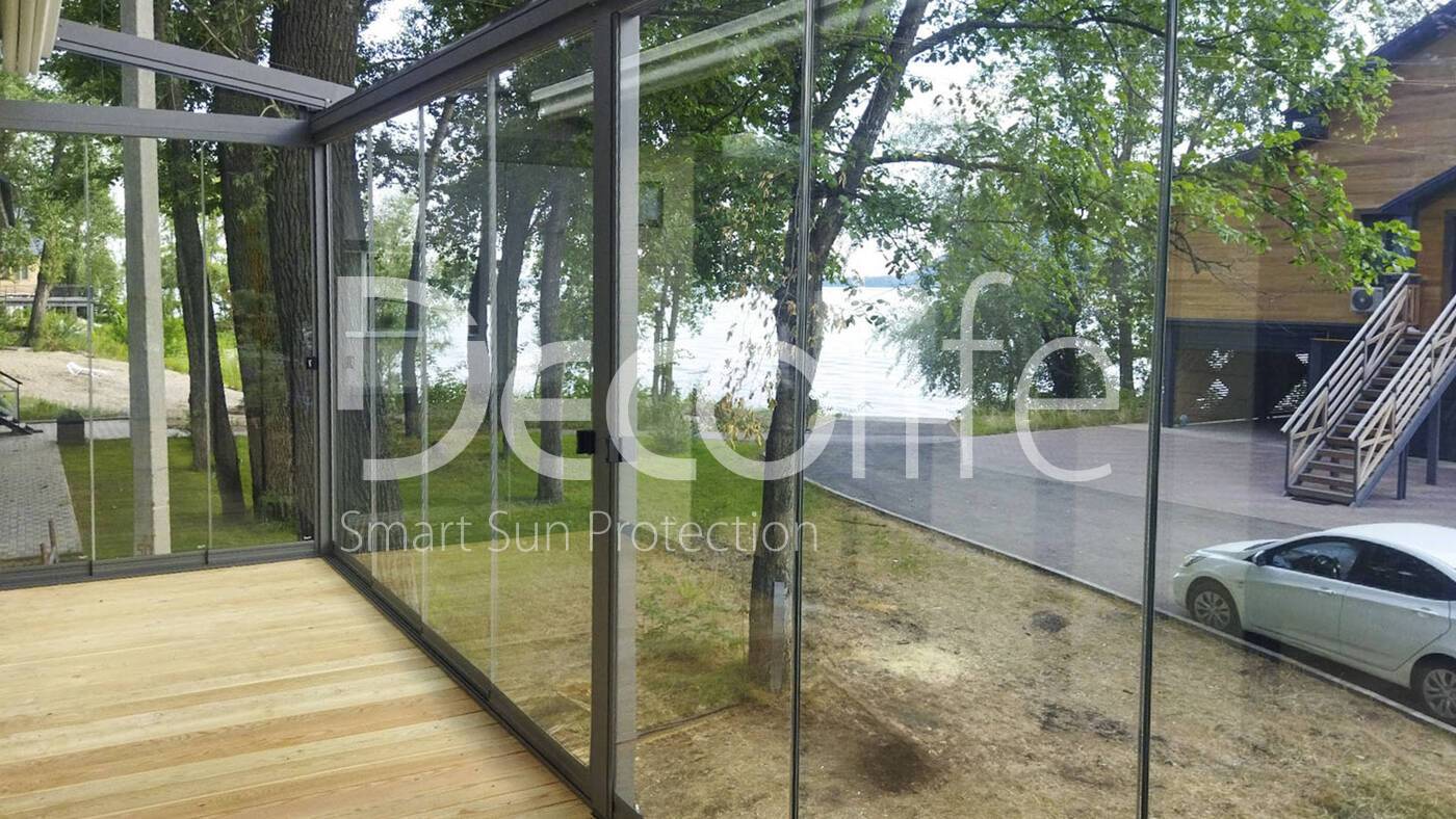Главная / Наши работы / Пергола тентовая Decolife Solo Project + безрамное остекление S150 г. Самара