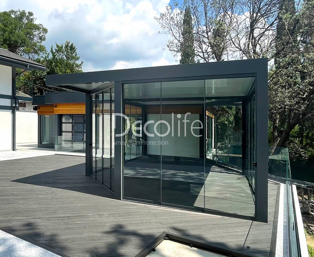 Пергола Decolife В600 PIR + Раздвижное безрамное остекление S200 - Симеиз